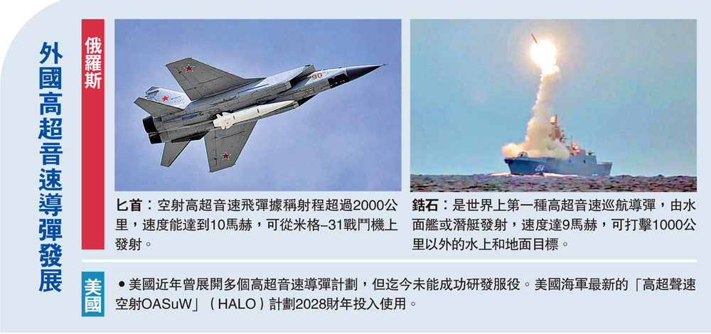 •美國近年曾展開多個高超音速導彈計劃,但迄今未能成功研發服役。美國海軍最新的「高超聲速空射OASuW」(HALO)計劃2028財年投入使用。