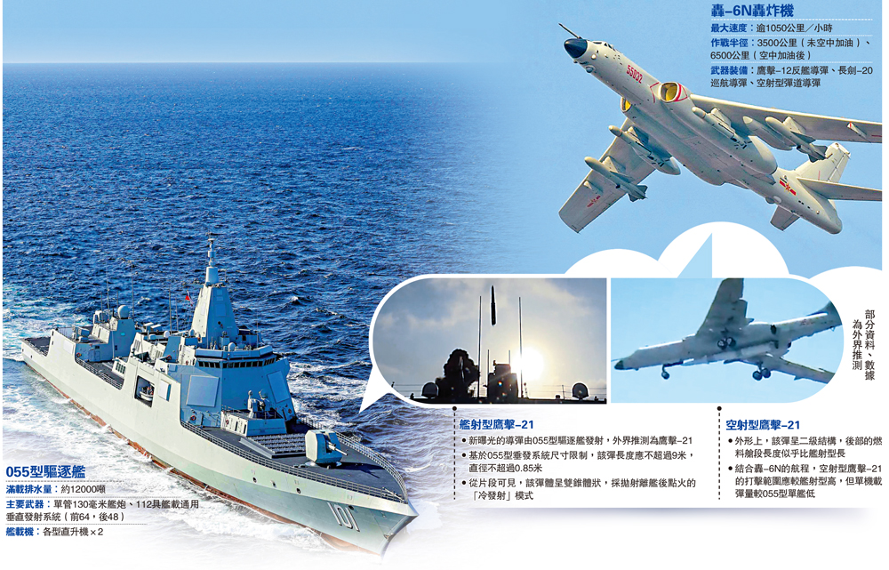 上月海軍成立紀念日前夕,艦射型與空射型鷹擊-21反艦彈道導彈亮相,分別以055型萬噸大驅和升級版「戰神」轟-6N戰略轟炸機為發射平台,艦射型射程約為1000公里,空射型可達1500公里。中國成為世界上首個擁有陸海空三位一體反艦彈道導彈打擊體系的國家,大幅提升應對航母的區域拒止能力。\馬浩亮(文)