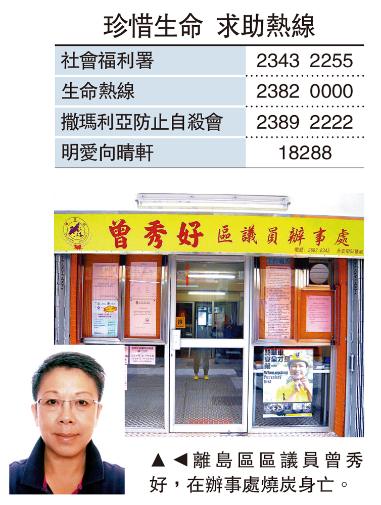【大公報訊】記者周亮恒報道:坪洲及喜靈洲區議員曾秀好燒炭自殺身亡。昨日中午警方接獲報案,指永安街58號地下辦公室內一名女子懷疑燒炭自殺,昏迷不醒。消防及救護人員趕至,破門入內發現一名中年女子暈倒,身旁有一盤燒過的炭,經檢驗後證實女事主明顯死亡。