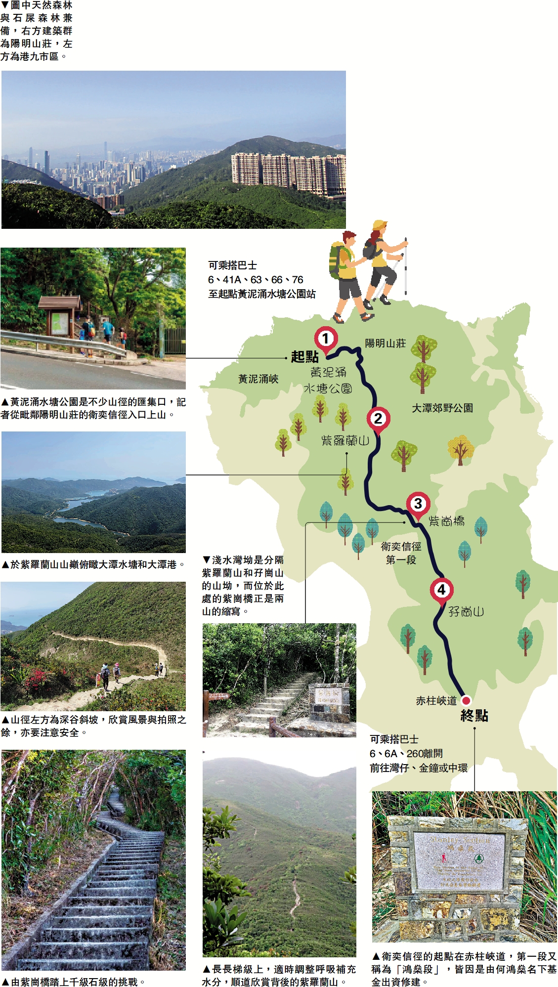 逆走衛奕信徑第一段的起點臨近黃泥涌水塘,可乘港島巴士路線6、41A、63、66、76在「黃泥涌水塘公園」站落車,巴士站位於油站旁,油站出口有條樓梯有指路牌,上樓梯頂後轉左接入大潭水塘道。需留意的是,黃泥涌水塘公園是不少山徑的匯集口。黃泥涌水壩盡頭旁邊,是紫羅蘭山徑和大潭郊遊徑入口,沿路也可接回衛奕信徑往紫羅蘭山。記者選擇往陽明山莊方向繼續行,從毗鄰陽明山莊的衛奕信徑入口上山。