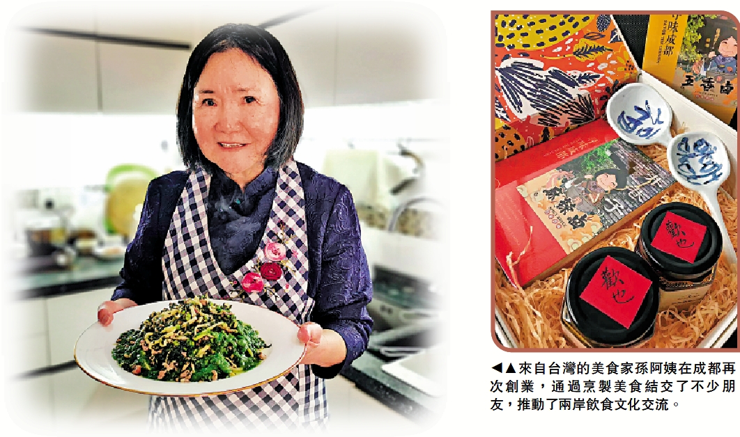在把台灣風味與成都美食融合的過程中,孫阿姨開過美食課「四川人的餐桌可有一碟『台灣味』」、做過分享「兩岸共飲一壺春」、組織過包餃子活動「同包、同胞」,反響很熱烈。「兩岸一家親不是掛在嘴上,而是要融入日常生活,對於家國的情懷,也在從小的味覺記憶裏。無論來自哪裏、走向何方,身在異鄉的中國人,都會在一道道美食傳承裏,感受到對家鄉和祖國的眷念。」