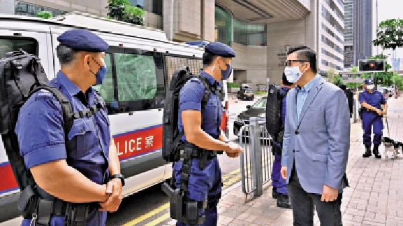 鄧炳強在警務處港島總區指揮官郭柏聰和港島總區副指揮官林鴻釧的陪同下,首先巡視會展周邊範圍,了解警方在布防、調配策略及交通封路的安排,同時為當值的紀律部隊人員打氣。