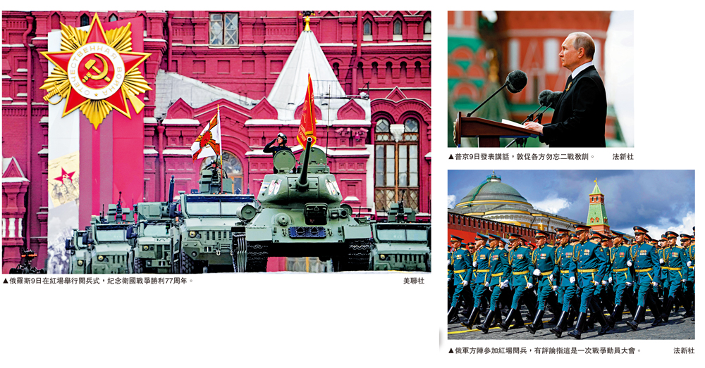 普京9日表示,1945年5月9日被永遠載入史冊,我們為英勇的勝利者感到驕傲,我們的職責是銘記他們的教誨,保持警覺並盡力確保世界大戰不會重演。普京指出,去年12月俄方提議簽署安全保障條約,但北約國家不願傾聽,圖謀「入侵我們的土地」,因此俄方「先發制人地進行回擊」。他表示,北約對俄羅斯構成明顯威脅,俄方對烏軍事行動是必要的,也是正確的,如今在烏克蘭東部頓巴斯地區的俄軍和志願者正在「為祖國及其未來而戰」。