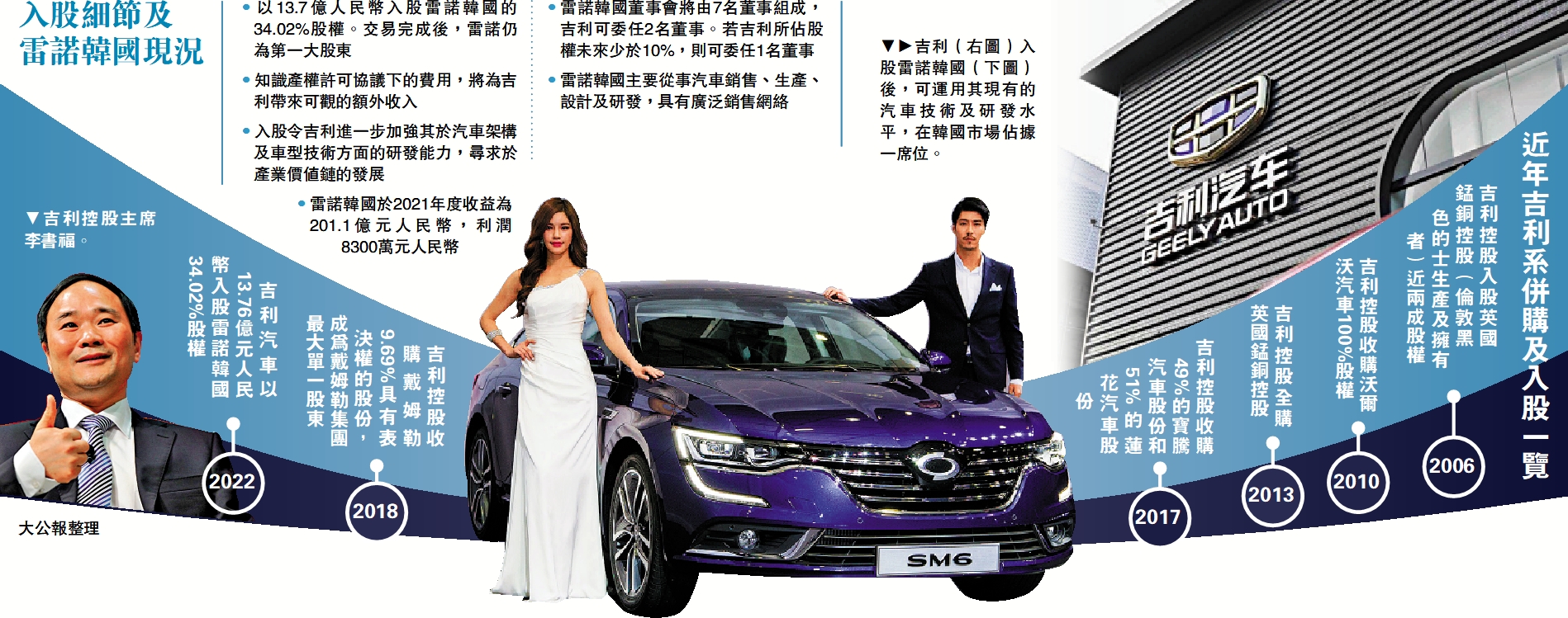 吉利控股近年積極進行併購及入股活動,旗下吉利汽車(00175)昨再有新動作,宣布以約2640億韓圜(約16.06億港元)入股雷諾韓國(Renault Korea Motors)的34.02%股權,進軍韓國市場。吉利表示,是次入股將加強汽車架構及車型技術的研發能力,且知識產權許可協議項下應收的費用,預期將為吉利帶來可觀的額外收入。然而,分析指出,雷諾在韓國銷量不及起亞及現代等,且韓國市場有限,是次入股效益有待觀察。\大公報記者 李永青