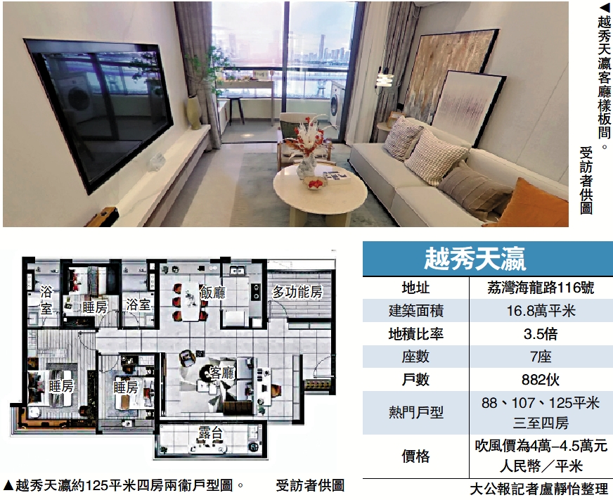 越秀天瀛是廣州5月正式開賣的新樓盤之一,位於荔灣海龍科創區,直線距離花地河約50米左右。這個項目總戶數882伙,首推2、3棟88至127平米的3至5房。樓盤銷售告訴記者,這個樓盤因為性價比高,比較適合剛需和改善購房群體。記者了解到,目前該項目吹風價為每平米4萬至4.5萬元人民幣,價格相對周邊樓盤較低,但周邊舊改需要時間,城市面貌暫時一般。