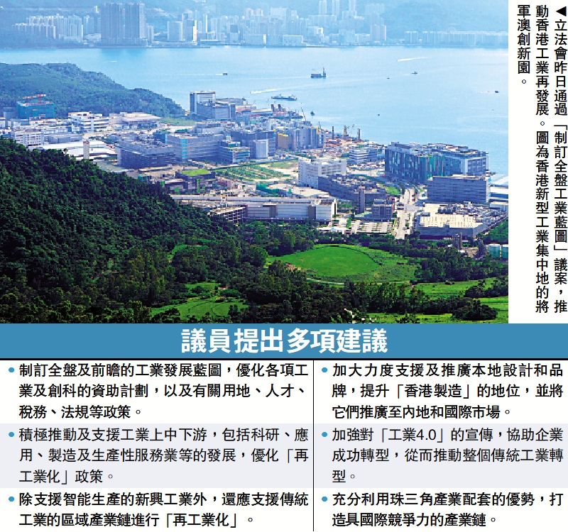 由紡織及製衣界立法會議員陳祖恒提出的「制訂全盤工業藍圖,推動香港工業發展」議員議案,昨日在立法會獲得通過。議案促請架構改組後將成立的創新科技及工業局推出一系列政策措施,以推動香港工業發展。
