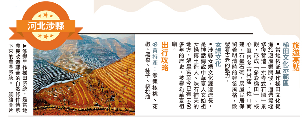 2014年,涉縣旱作石堰梯田系統被原農業部認定為「中國重要農業文化遺產」,這一系統曾被到訪的聯合國世界糧食計劃署專家稱作「了不起的人間奇跡」。古老的耕作方式倔強地延續至今,由農耕文化衍生出的農旅產業也正為歷經滄桑的太行梯田注入新活力。\綜合新華網、人民網