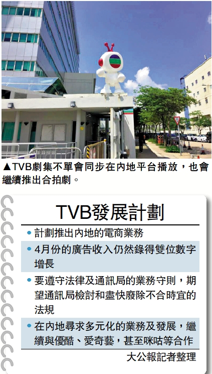 至於內地發展,主席許濤表示,TVB在內地尋求多元化的業務及發展,除將在港拍攝的劇集同步在內地平台播放外,亦會繼續與優酷、愛奇藝,甚至咪咕等合作,並推出合拍劇,包括《白色強人2》、《法證先鋒5》等。