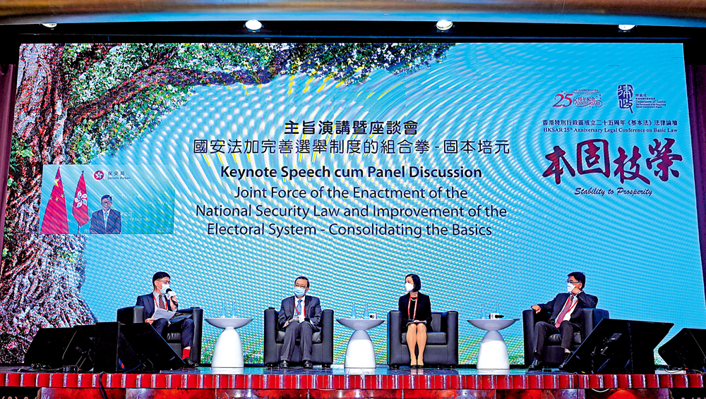 律政司昨日舉行以「本固枝榮」為題的「香港特別行政區成立25周年基本法法律論壇」,論壇設有多個主旨演講環節,並分別圍繞「香港國安法加上完善選舉制度的組合拳」、「香港蓬勃發展的資本主義制度」、「為什麼普通法對香港的自由經濟體舉足輕重」,以及「坐言起行」等主題舉行座談會。