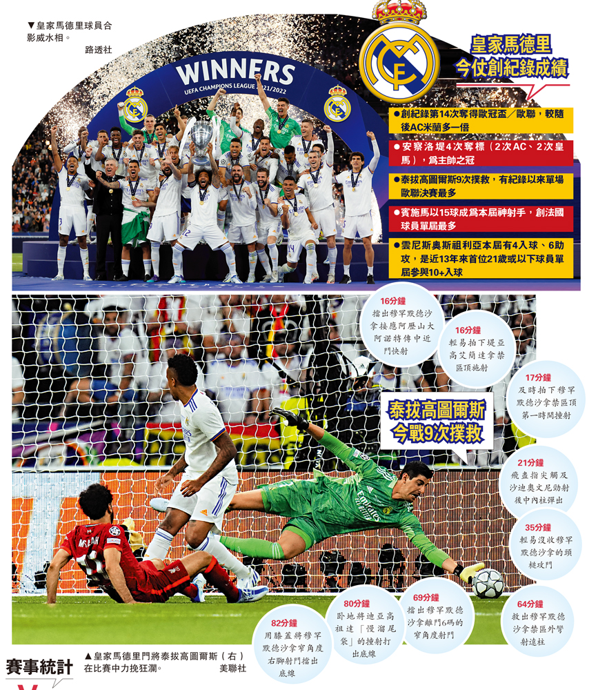 儘管矢志復仇的穆罕默德沙拿果然有所表現,創紀錄作出6次中目標的攻門,偏偏對方門將泰拔高圖爾斯卻有更爭氣的演出,悉數阻止沙拿入球之外,亦創造單場歐聯決賽紀錄的全場作出多達9次撲救,並靠隊友雲尼斯奧斯祖利亞在下半場的入球,助皇家馬德里於昨天凌晨歐聯決賽以1:0勇挫大部分時間佔據上風的利物浦,延續奪標次數至第14次。曾效力車路士的高圖爾斯,賽後獲選為今仗的最佳球員,他直言是向英國傳媒對自己欠尊重的大反擊。\大公報記者 譚德龍