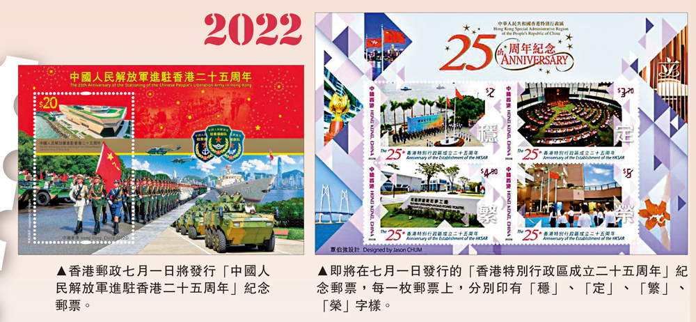 香港郵政早前公布,即將在七月一日發行「香港特別行政區成立二十五周年」紀念郵票及「中國人民解放軍進駐香港二十五周年」紀念郵票,前者包括一套四枚紀念郵票、一張小全張和相關集郵品,紀念郵品展現香港的繁榮發展,每一枚郵票上,分別印有「穩」、「定」、「繁」、「榮」字樣,後者則是一張郵票小型張。