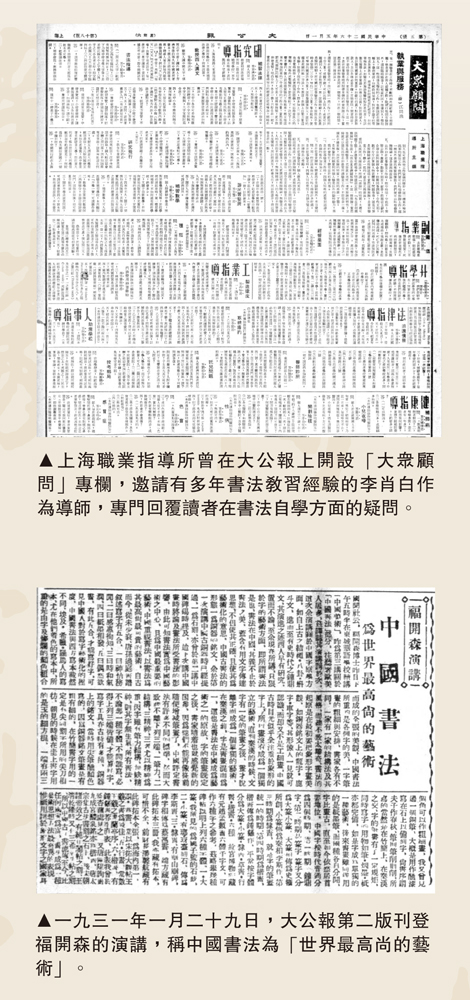 為了使讀者更方便地自學書法,上海職業指導所曾在報上開設「大眾顧問」專欄,邀請有多年書法教習經驗的李肖白先生作為導師,專門回覆讀者在書法學習方面的疑問。自一九三六年六月至一九三七年五月,大公報共刊登六十餘期「書法指導」,答覆讀者來信二百餘則。專欄內容以臨摹碑帖推薦、點評讀者作品為主,所薦碑帖篆書如《石鼓文》,隸書如《張遷碑》《禮器碑》,楷書如《顏勤禮碑》《張猛龍碑》,行書如《聖教序》《蘭亭十三跋》,草書如《孫過庭書譜》等,這些也都是當代學習書法者必須要臨摹的經典作品。