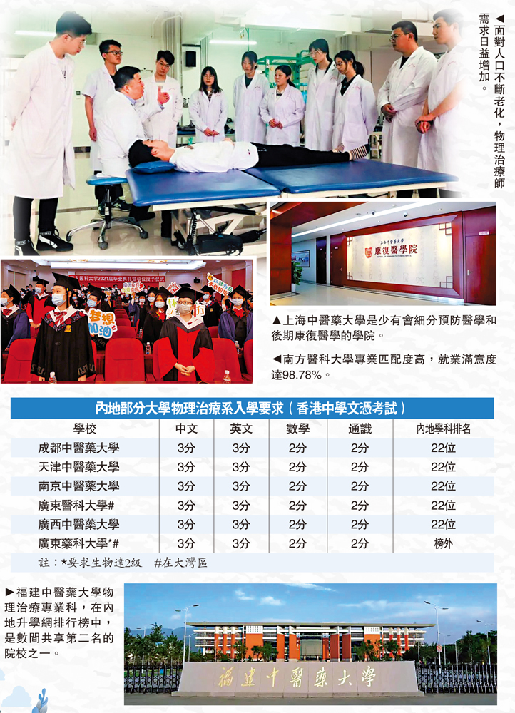 為了供有志於此專業發展的同學更多選擇,今期升學資訊為大家介紹內地不同的物理治療(康復治療)專業,助你的「錢」途更美好。\大公報記者 張凱晴