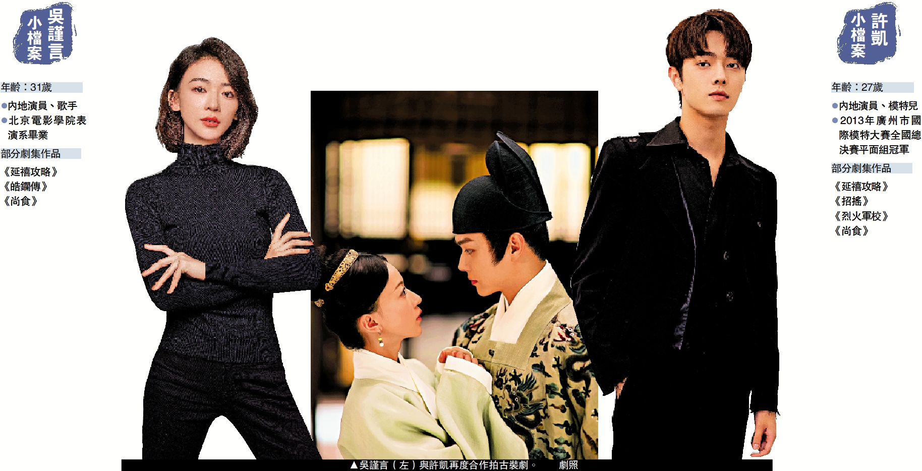 2018年,劇集《延禧攻略》在香港及內地均掀起熱潮,主角吳謹言與許凱火速走紅,二人在劇中飾演的魏瓔珞與傅恆有緣無分。相隔四年,這對熒幕情侶再度合作,於劇集《尚食》中續前緣。吳謹言與許凱期待下一次的合作,可以攜手衝出「宮牆」,挑戰現代角色。\大公報記者 文霏霏