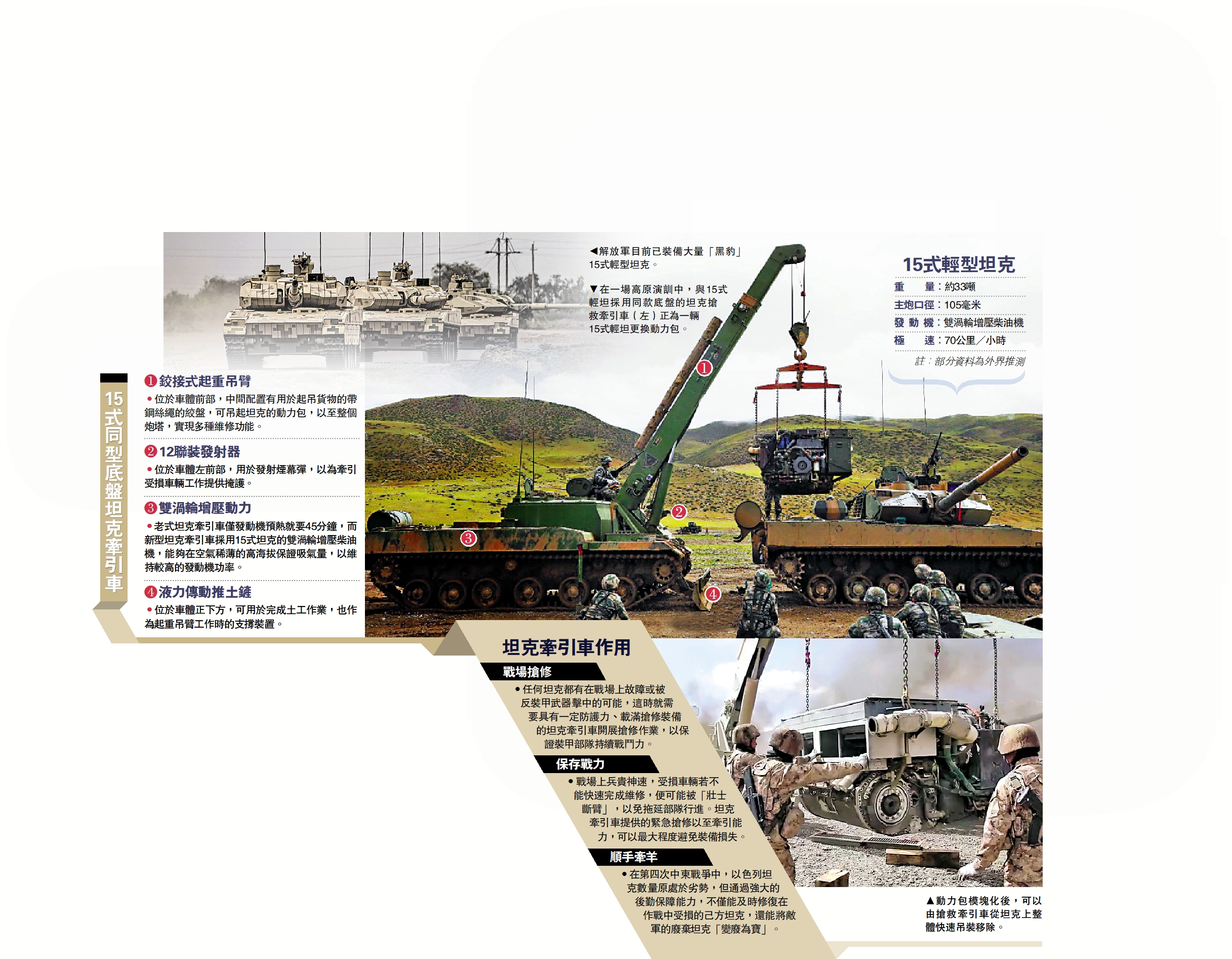 坦克搶救牽引車,有「坦克救星」之稱,在戰場上伴隨坦克行進,並及時對受損坦克進行實施緊急搶修或牽引撤離危險地帶,是地面部隊的重火力打擊能力的堅實保障。近日解放軍一款基於「黑豹」15式新輕型坦克同款底盤的坦克搶救牽引車亮相演訓場,具有與「黑豹」同級的雪域高原機動能力,堪稱其保存戰力的最強後盾。\馬浩亮(文)