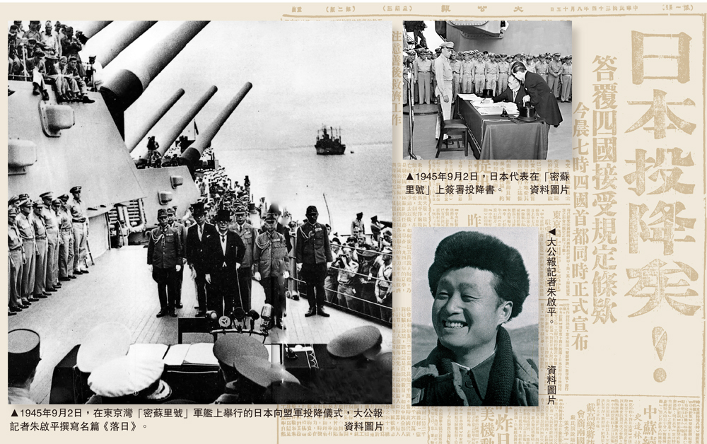 當時,艦上共有世界各國200多名記者,只有3位來自中國。朱啟平站在一座在20厘米口徑的機關槍上臨時搭起的木台上,距離簽字桌只有兩三丈遠。而他的同事、另一位《大公報》記者黎秀石,則站在第二層甲板,居高臨下正對着簽字台,正是拍照的絕佳角度。