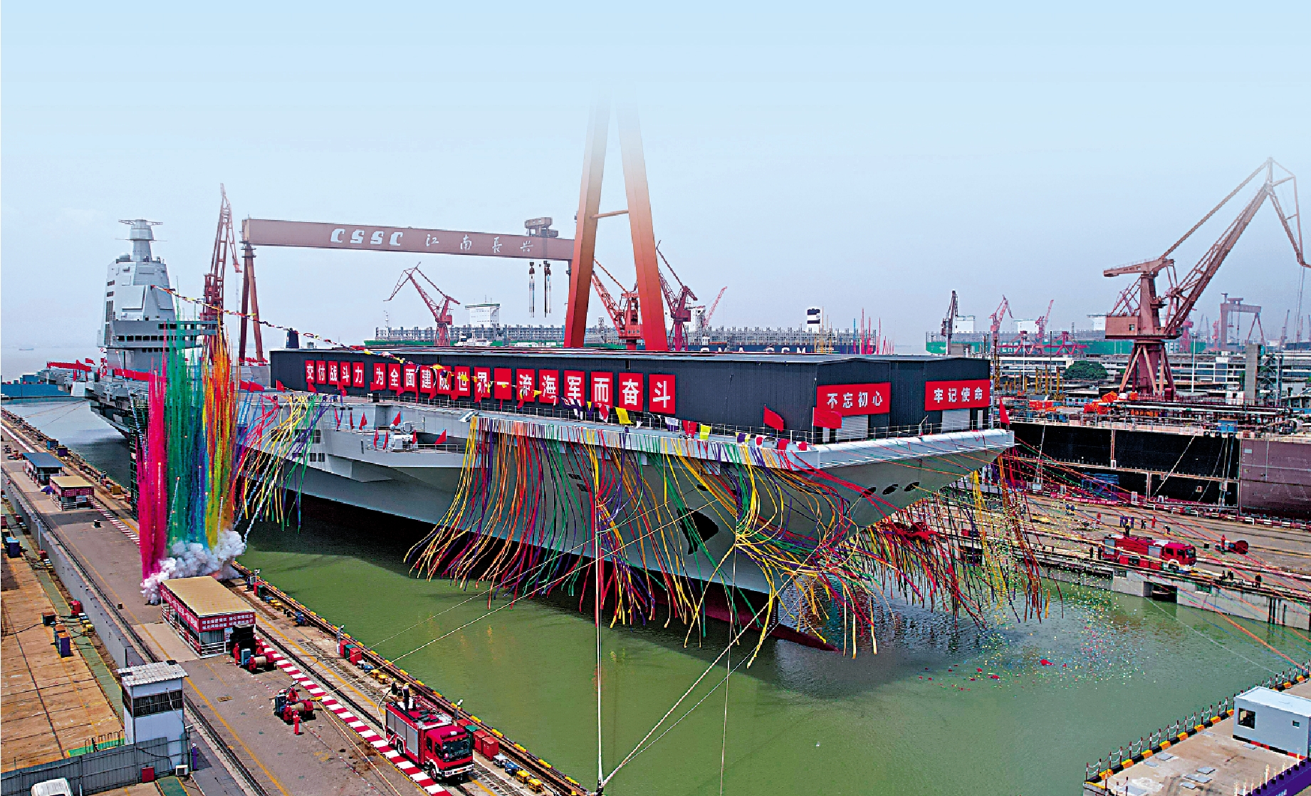 17日上午,中國第三艘航空母艦下水命名儀式在中國船舶集團有限公司江南造船廠舉行。中共中央政治局委員、中央軍委副主席許其亮出席儀式。經中央軍委批准,中國第三艘航空母艦命名為「中國人民解放軍海軍福建艦」,舷號為「18」。福建艦是中國完全自主設計建造的首艘彈射型航空母艦,採用平直通長飛行甲板,配置電磁彈射和阻攔裝置,滿載排水量8萬餘噸。該艦下水後,將按計劃開展繫泊試驗和航行試驗。已列裝遼寧艦和山東艦的解放軍昂首邁向三航母時代。\大公報記者 張寶峰北京報道