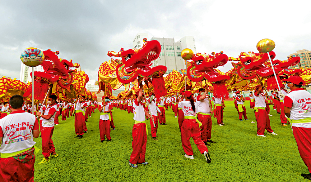 為熱烈慶祝香港回歸祖國25周年,新界社團聯會和青晉義工團昨日下午在元朗大球場舉行「五光十色 祥龍慶回歸」活動啟動禮,場面盛大。2500名青年舞動25條大金龍,擺出「25」字樣和「祥龍盤旋」等造型,寓意香港由治及興再出發,你我同為香港開新篇,祝福祖國繁榮強盛!\大公報記者 吳維思