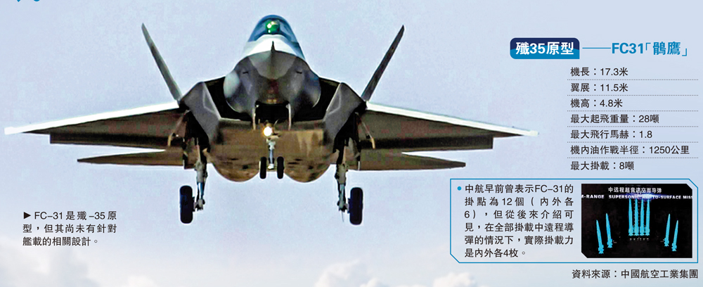 殲-35是繼殲-20「威龍」之後中國第二型隱身戰機,也是繼殲-15「飛鯊」之後第二型艦載戰機。殲-35是在FC-31「鶻鷹」雙發戰機基礎上升級改進而成,採取可摺翼設計,翼展增大,座艙罩縮短。以FC-31相關參數推測,殲-35最大飛行速度約1.8馬赫,最大作戰半徑1250公里。
