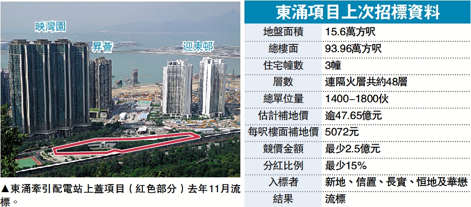 該鐵路上蓋項目位於文東路,旁為東涌北公園,港鐵去年推出招標時,雖有35家本地及內地發展商遞交意向書,但最終因項目的補地價高昂,每呎樓面超過5000元之餘,發展商更要在發展權競價及賣樓分紅上再以高者決雌雄,此令發展商難以取得合理回報下,當時雖有5家發展商入標,但港鐵最終不接納任何一份標書。