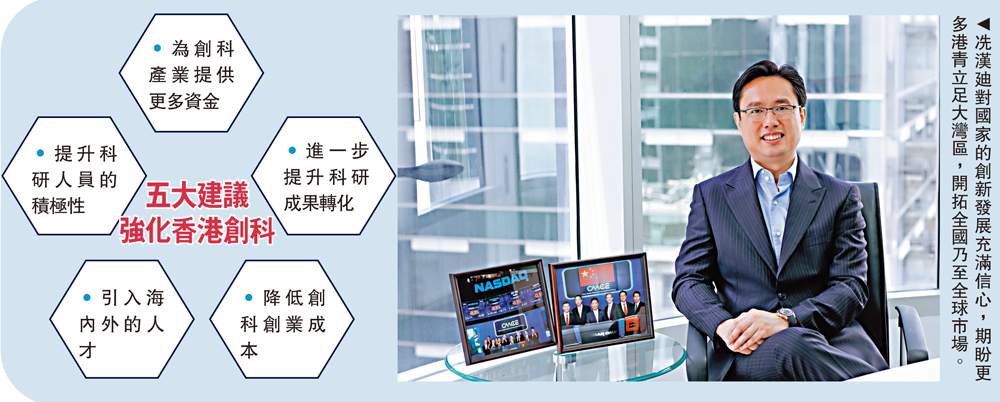 「香港創科發展,迎來歷史上最好的時機。」互聯網專業協會會長、科技創新界選委冼漢廸接受《大公報》專訪時說道,在國家賦予香港國際創科中心的巨大機遇下,特區政府可進一步加強創科生態環境建設,如提供靈活的政策,為創科產業提供更多資金、提升科研人員積極性、進一步提升科研成果轉化、引進海內外人才及降低創業成本等方面下功夫。\大公報記者 林靜文