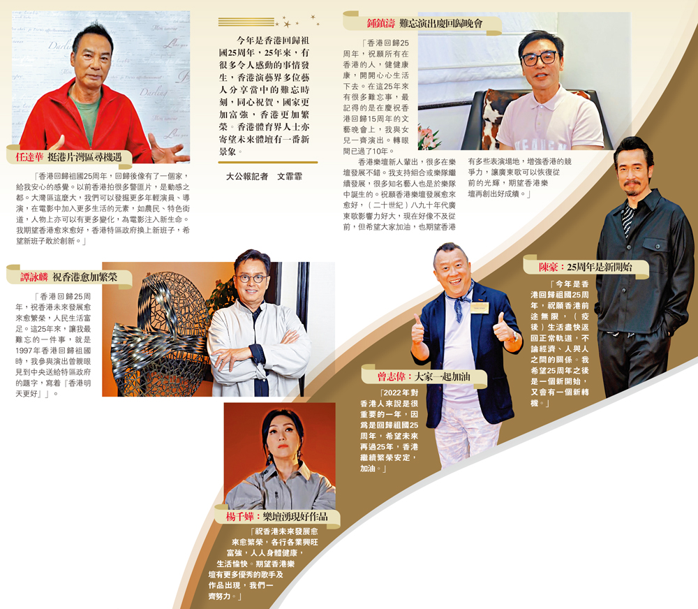 今年是香港回歸祖國25周年,25年來,有很多令人感動的事情發生,香港演藝界多位藝人分享當中的難忘時刻,同心祝賀,國家更加富強,香港更加繁榮。香港體育界人士亦寄望未來體壇有一番新景象。\大公報記者 文霏霏