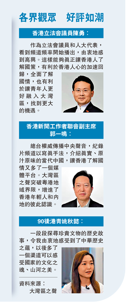 總台權威傳播中央聲音,紀錄片頻道以寫真手法,介紹真實、原汁原味的當代中國,讓香港了解國情又多了一個媒體平台。大灣區之聲突破粵港地域界限,增進了香港年輕人和內地的彼此認識。
