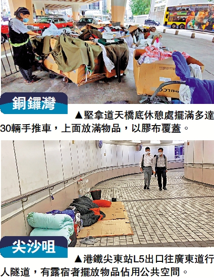 上圖:堅拿道天橋底休憩處擺滿多達30輛手推車,上面放滿物品,以膠布覆蓋。