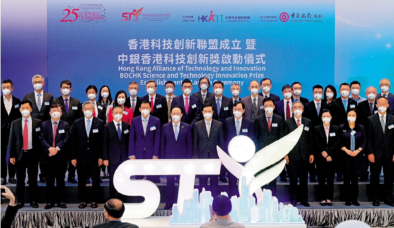 「香港科技創新聯盟成立暨中銀香港科技創新獎啟動儀式」昨日在中銀大廈舉行。行政長官李家超、中聯辦副主任譚鐵牛、創科及工業局局長孫東、中聯辦教科部部長蔣建湘、中銀香港副董事長兼總裁孫煜,以及聯盟創會主席盧煜明出席主禮。國家科學技術部部長王志剛與中國銀行暨中銀香港董事長劉連舸透過視像致辭。