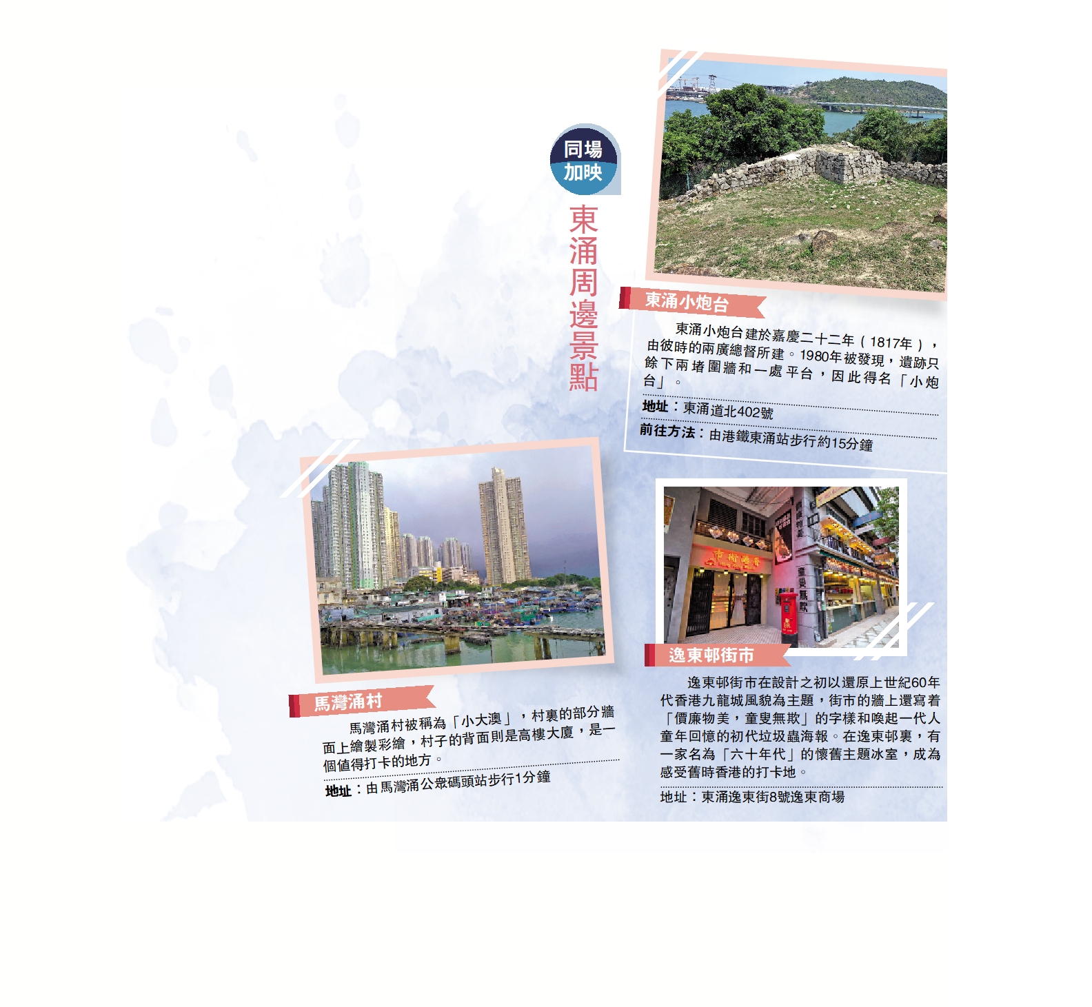 逸東邨街市在設計之初以還原上世紀60年代香港九龍城風貌為主題,街市的牆上還寫着「價廉物美,童叟無欺」的字樣和喚起一代人童年回憶的初代垃圾蟲海報。在逸東邨裏,有一家名為「六十年代」的懷舊主題冰室,成為感受舊時香港的打卡地。