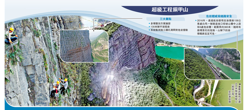近年來,中國憑藉一系列大規模基礎建設和超級工程,讓天塹變通途,驚艷世界。重慶武隆烏江邊400米懸崖絕壁上,一件垂直高度近百米的鋼筋水泥「鋼甲衣」將2.5萬噸的危岩體牢牢地釘在山體上。這項「超級工程」猶如巍巍大山穿「鎧甲」,也被稱為「鋼甲山」。歷時兩年半的危岩體增設防護設施工程創造了兩個「世界第一」,一是垂直立體腳手架高度,二是世界首例「原位加固」。\大公報記者 韓毅