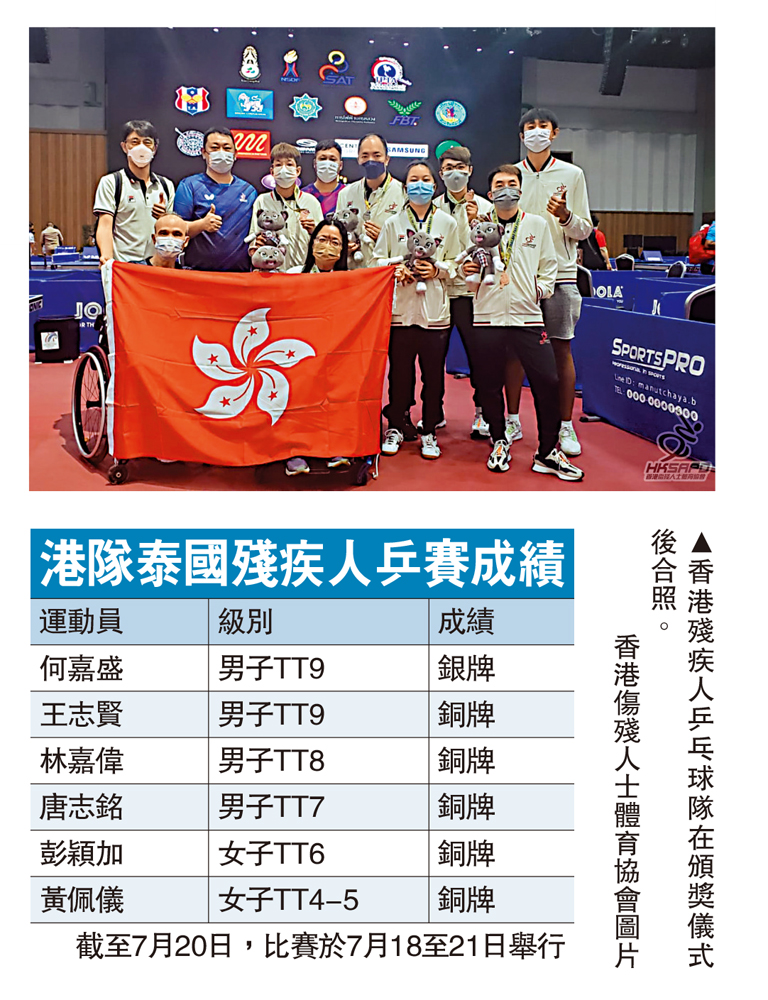 ITTF泰國殘疾人乒乓球公開賽前晚在芭堤雅完成單打賽事,香港隊獲得1銀5銅共6面獎牌,何嘉盛出戰男子TT9級賽事,他於小組賽以2勝1負出線,他在8強勝伊朗球手,4強勝隊友王志賢,可惜他於決賽不敵西班牙球手,仍獲得一面銀牌,王志賢則因不設季軍戰獲銅。其餘男子TT8級的林嘉偉、男子TT7級的唐志銘,及女子TT6級球手彭穎加與女子TT4-5級的黃佩儀均在4強出局,亦因不設季軍戰獲銅。