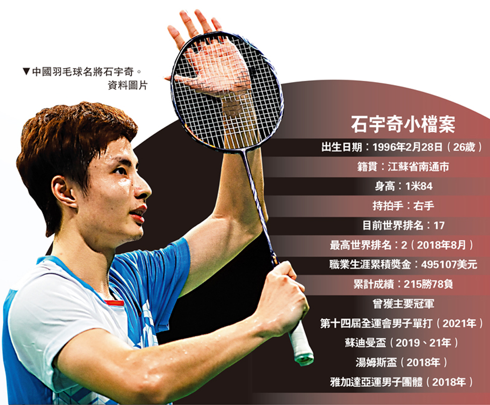 石宇奇是中國羽毛球男子單打名將,被視為林丹、諶龍之後中國男子單打的領軍人物,曾獲得全英公開賽、世界羽聯總決賽冠軍,並隨隊奪得蘇迪曼盃、湯姆斯盃冠軍。去年東京奧運會他晉級男單八強,隨後還奪得陝西全運會男單冠軍。