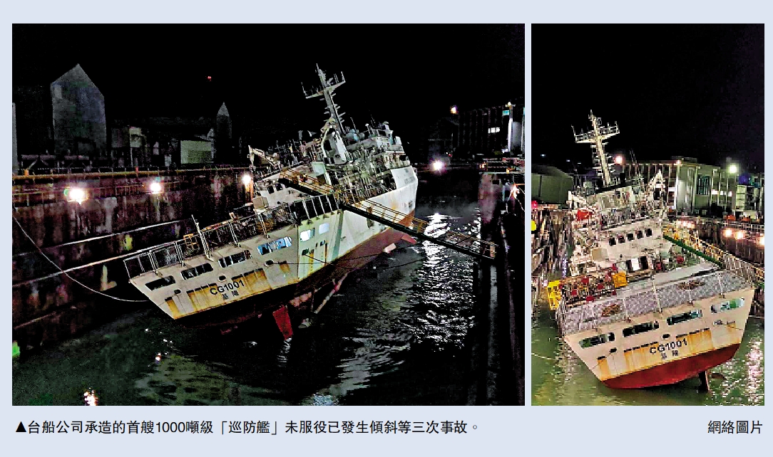【大公報訊】台灣地區自行製造的武器裝備又出問題。繼先前台產「玉山艦」因漏水被嘲笑是「潛水艇」後,台船公司承造的首艘1000噸級「巡防艦」也頻頻「出包」(出錯),先後出現「邊墩(船塢設備)」歪掉、抽水過程中傾斜導致損毀等質量問題。軍事專家王雲飛向大公報表示,台軍這艘1000噸級「巡防艦」主要用於近海的警戒、巡邏等任務,在建造過程中一而再、再而三出現問題,說明台船的建造質量令人堪憂,台軍戰力受質疑。