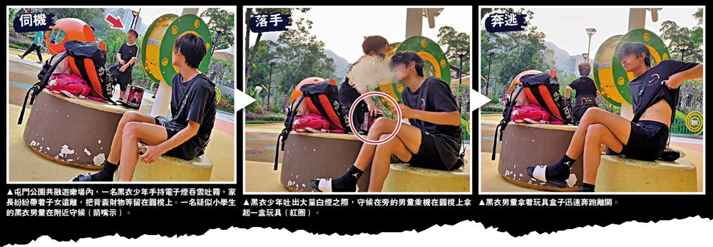 其間,一名年紀較大(估計為中學生)的男童,無視遊樂場所禁煙的規定,拿起電子煙吸食,旁邊的家長馬上帶着小童避開,擺放在櫈上或地下的個人物品亦變得無人看管。此時,另一名看上去似是小學生的男童緩緩走近,悄悄拿走一盒模型公仔,即拔足跑走。記者全程拍下這幕盜竊過程。
