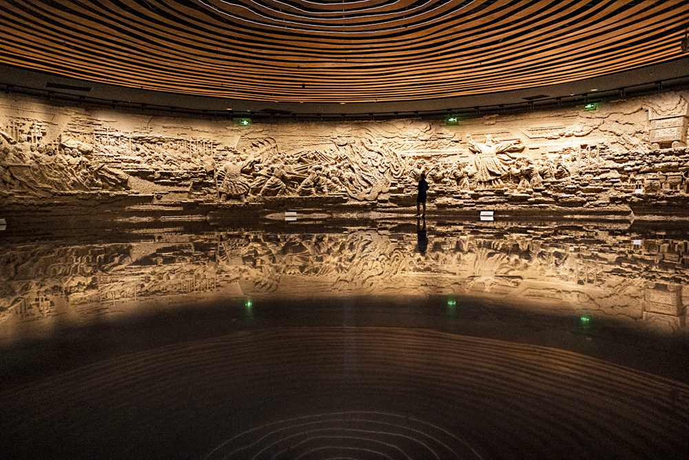 七月二十六日,鄭州商都遺址博物院正式向公眾開放。該博物院位於商都國家考古遺址公園內,是一座專題遺址博物館,展廳面積約五千五百平方米,展出青銅器、玉器、骨器、陶器等文物一千餘件,並利用沙盤模型、場景復原、聲光電技術等輔助手段,展示鄭州商城遺址出土文物、遺跡、考古研究、遺址保護成果等內容。圖為展廳內的環形浮雕牆。\新華社