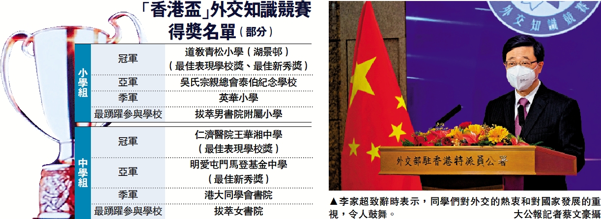 余淑儀表示,外交知識競賽內容圍繞國家外交政策、中國歷史以及中國文化,令學生明白國家如何參與全球治理。此外,今年是香港回歸祖國25周年,競賽部分題目涉及基本法的重要性、「一國兩制」的特色、大灣區發展的情況、香港歷史等,加深了對國家、香港發展的了解,例如粵港澳大灣區建設其中一個重要目標是鞏固和提升香港國際金融、航運、貿易三大中心地位。余淑儀希望將來能夠成為一名教師,以教師身份鼓勵她的學生認識國家以及世界發展大局。 大公報記者 吳俊宏