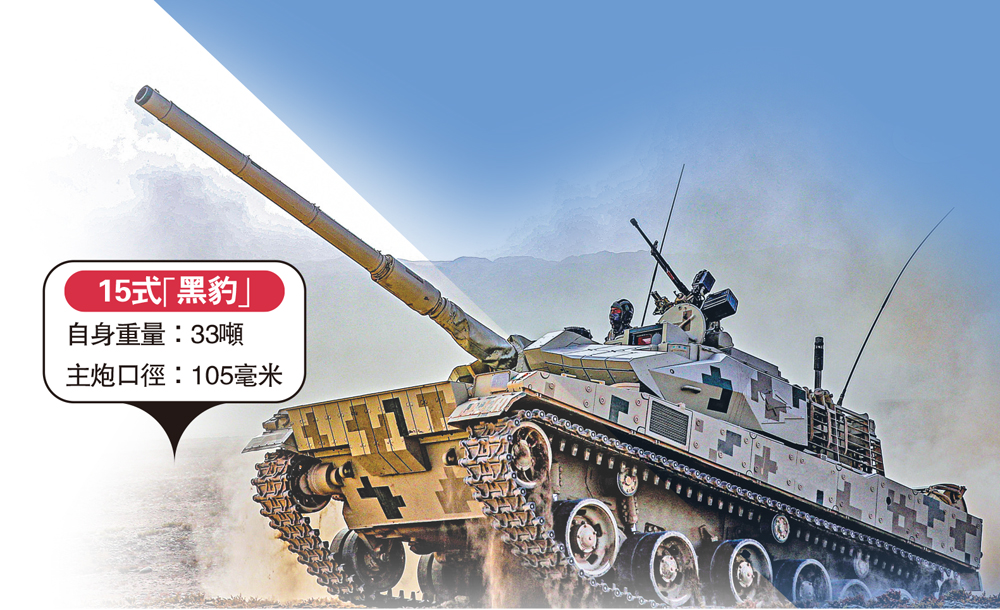15式「黑豹」新輕型坦克在2019年大閱兵首次公開亮相,具形小、火力強、機動快等特點,配備了兩級渦輪增加發動機,動力強勁,自身重量只有33噸,並採用了液氣懸掛系統,可靈活調整車體高度和縱傾,根據不同地形靈活自由前後左右俯仰,能適應各種複雜地形環境尤其是高原山地作戰。