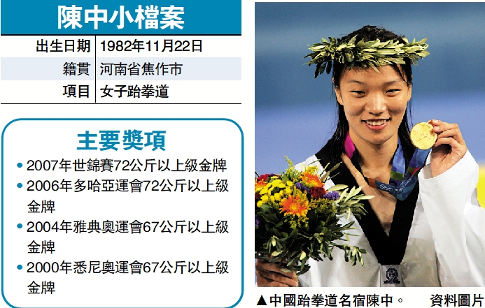 2000年悉尼奧運會上,跆拳道成為奧運會正式比賽項目。在女子67公斤以上級決賽中,陳中為中國隊贏得第一枚跆拳道奧運金牌。四年後的雅典奧運會上,陳中衛冕冠軍。此後,陳中在2006年和2007年分別奪得多哈亞運會金牌和世錦賽金牌,實現跆拳道世界賽事大滿貫。