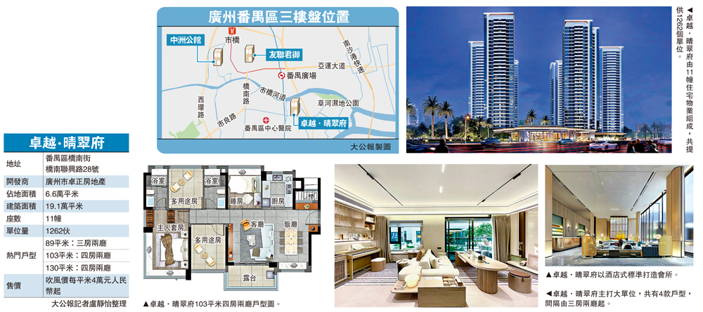 市橋是番禺的老城中心區,開發建設趨於飽和,所以市橋板塊內近3年幾乎零新盤供應,今年終於有突破。卓越·晴翠府佔地6.6萬平米,總建築面積約19.1萬平米,地積比率2.8倍,共規劃興建11幢住宅,提供約1262個單位。戶型方面,設有89平米三房兩廳、分橫廳和直廳設計的103平米四房兩廳,以及130平米四房兩廳共4款間隔。