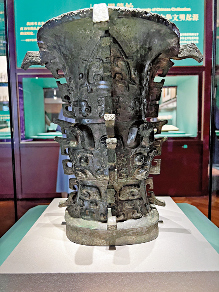 「斯文在茲」出自《論語》,意思是知識和文化在自己的手裏。展廳內西周早期青銅器文物「何尊」在聚光燈下熠熠生輝。這件青銅器是西周成王五年「何」姓貴族所作,其內底鑄有銘文12行、122字,被公認為最早出現「中國」字樣的器物。專家認為,何尊,作為「中國」一詞最早的見證,對於闡釋中華文明之源有着不可或缺的重要意義。