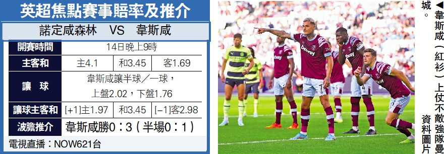 【大公報訊】綜合ESPN FC、香港賽馬會足智彩報道:英超諾定咸森林主場對韋斯咸今晚開打,雙方首場聯賽同樣以兩球不敵對手,然而「升班馬」森林依然以英冠式「高Q大棍」出戰,似乎難在英超立足,韋斯咸輸給曼城前鋒艾寧夏蘭特1人可說是非戰之罪。讓球韋斯咸讓半/一,可買上盤博韋斯咸反彈收錢。(NOW621台今晚9時直播)