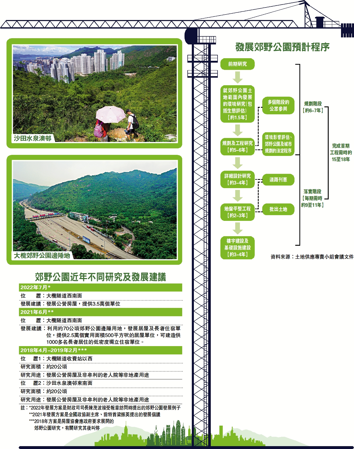 郊野公園發展要經過《郊野公園條例》及《環境影響評估條例》的法定程序,改劃土地用途亦要根據《城市規劃條例》進行評估及諮詢。土地供應專責小組當年的諮詢文件提到,發展郊野公園用地預期需時至少10年(詳見表)。