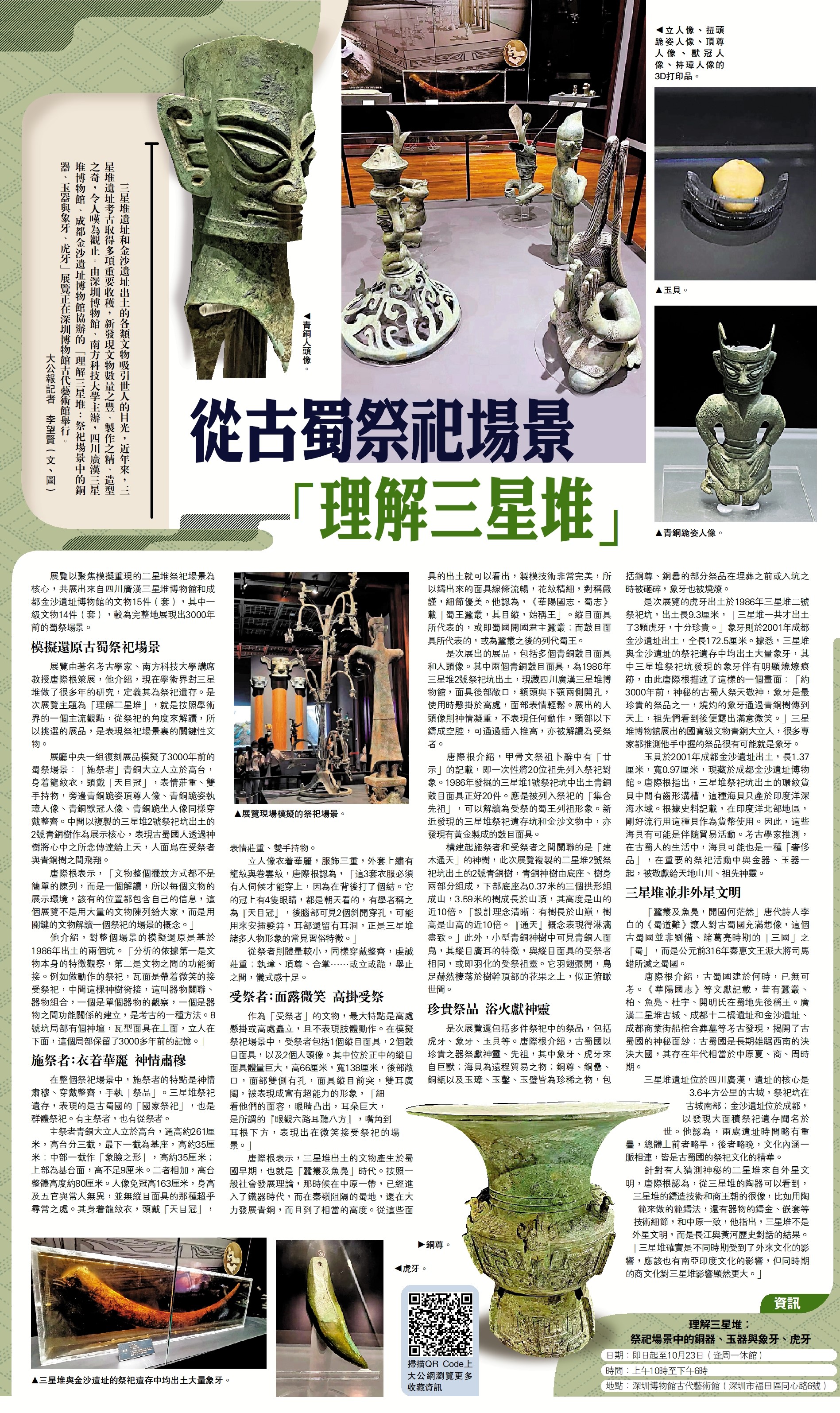 三星堆遺址和金沙遺址出土的各類文物吸引世人的目光,近年來,三星堆遺址考古取得多項重要收穫,新發現文物數量之豐、製作之精、造型之奇,令人嘆為觀止。由深圳博物館、南方科技大學主辦,四川廣漢三星堆博物館、成都金沙遺址博物館協辦的「理解三星堆:祭祀場景中的銅器、玉器與象牙、虎牙」展覽正在深圳博物館古代藝術館舉行。\大公報記者 李望賢(文、圖)