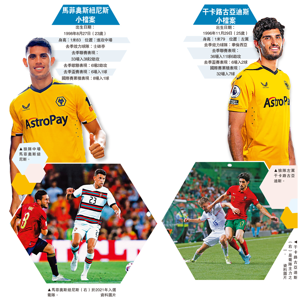 英超狼隊自從上一任葡萄牙主帥紐奴2017年中執教起,整支球隊不斷「葡萄牙化」,另一葡萄牙主帥般奴拿治去季上任後,依然奉行這套宗旨,今年夏天狼隊多名增兵中,轉會費最高是「葡萄牙孖寶」馬菲奧斯紐尼斯及干卡路古亞迪斯,兩人身價佔了狼隊今夏轉會費1.18億歐元的大半,至此狼隊已有11名力足踢正選的葡萄牙球員。兩名葡萄牙新兵均表示希望在英超大展身手,其中干卡路古亞迪斯已亮相英超,紐尼斯很快亦會上陣。\大公報記者 梁潤森