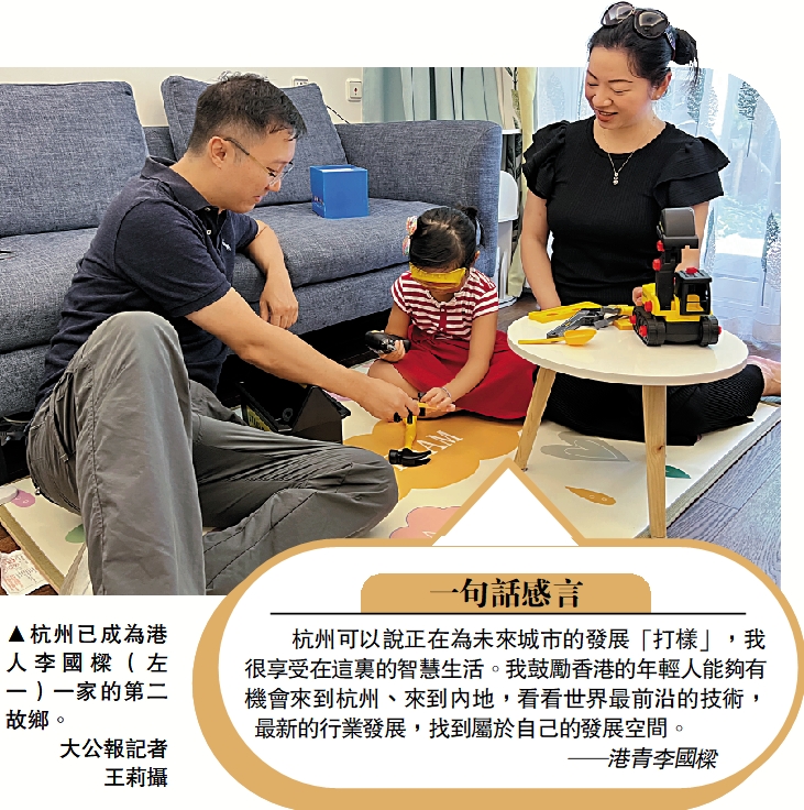 「如果問我女兒『你的家在哪裏』,她總是回答『我的家在杭州,我的老家在香港』。」Michelle與丈夫李國樑一起從香港來到杭州已經5年。借助杭州互聯網行業發展優勢,李國樑在金融科技領域取得了個人事業的突破,而Michelle一家也在被視為「未來城市樣板」的杭州享受着智慧生活的便利。「我在杭州被求婚、結婚生子,今年又順利完成了浙江中醫藥大學中醫學位課程,可以說我人生中的很多大事都是在杭州完成的,這裏已成為我們的第二故鄉。」Michelle笑着說。/大公報記者 王莉