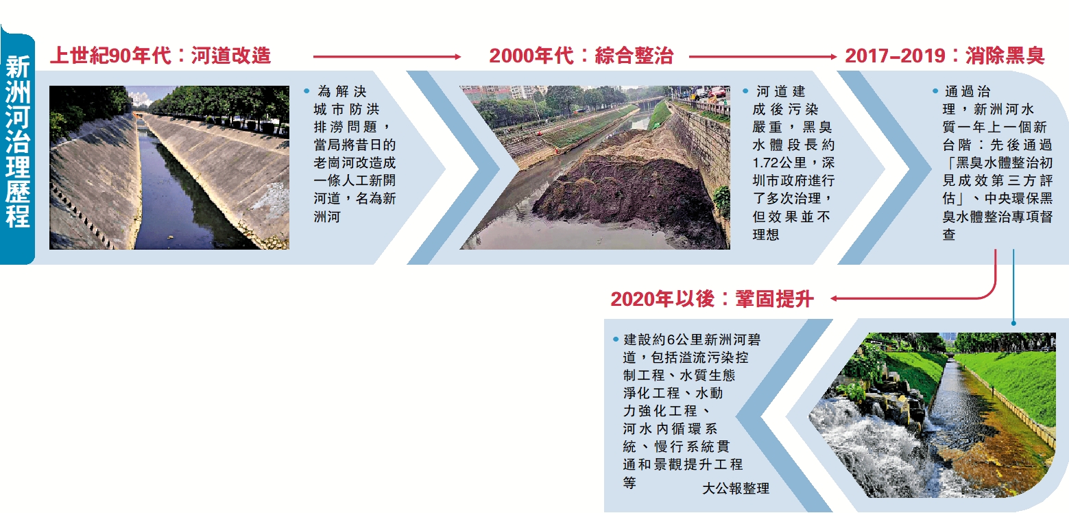 •建設約6公里新洲河碧道,包括溢流污染控制工程、水質生態淨化工程、水動力強化工程、河水內循環系統、慢行系統貫通和景觀提升工程等