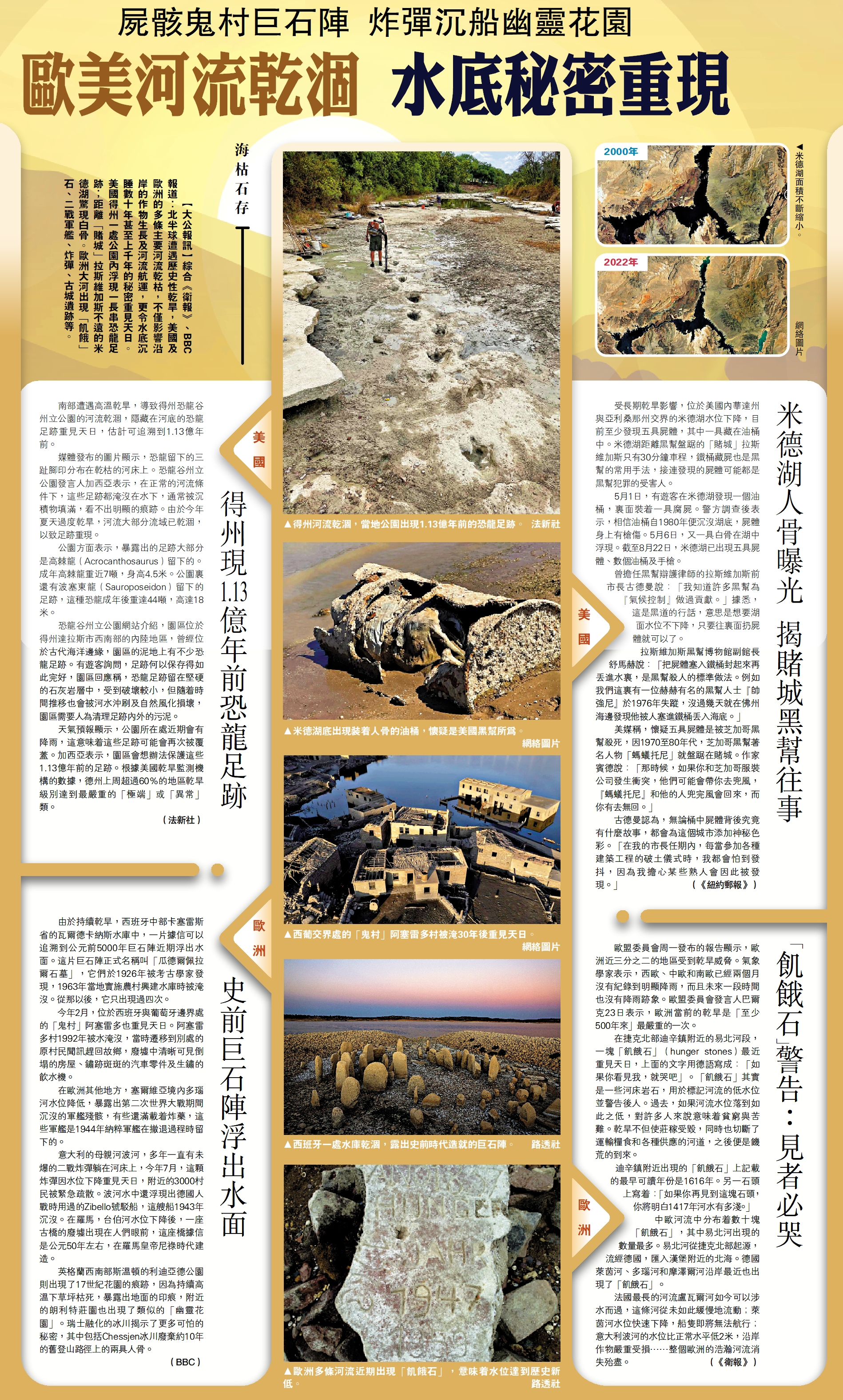 【大公報訊】綜合《衛報》、BBC報道:北半球遭遇歷史性乾旱,美國及歐洲的多條主要河流乾枯,不僅影響沿岸的作物生長及河流航運,更令水底沉睡數十年甚至上千年的秘密重見天日。美國得州一處公園內浮現一長串恐龍足跡;距離「賭城」拉斯維加斯不遠的米德湖驚現白骨。歐洲大河出現「飢餓」石、二戰軍艦、炸彈、古城遺跡等。