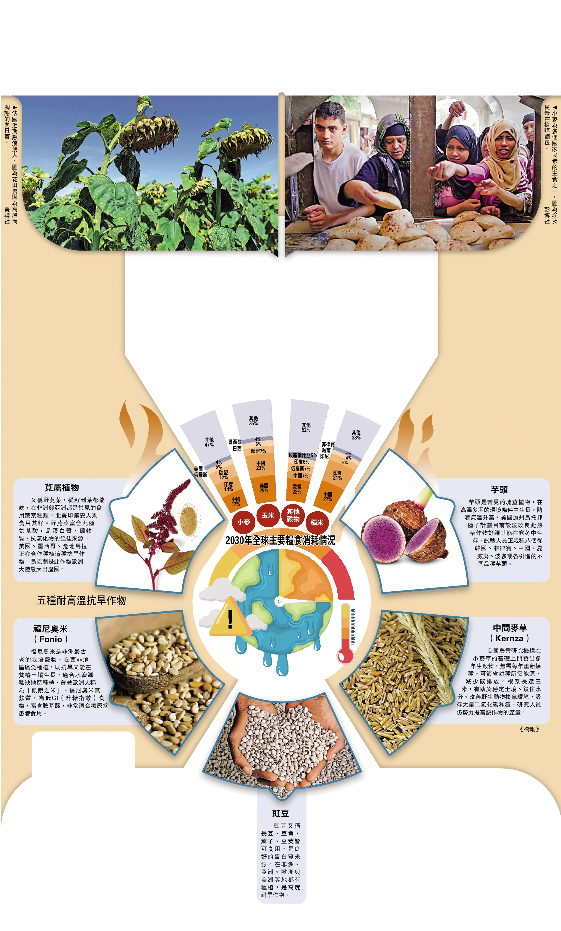 【大公報訊】綜合《衛報》、路透社、BBC報道:全球氣候變暖加速,近期的熱浪高溫,導致許多國家農業損失慘重,糧食作物岌岌可危。有預測稱,至2040年,高溫將導致全球糧食減產30%~40%。人類目前的主糧作物較為單一,隨着世界人口劇增,氣候變暖對農業發展帶來的挑戰也愈發艱巨。因此,農民和專家正將目光投向更耐高溫、耐旱的作物,同時希望通過新的育種方式,努力解決全球糧食安全問題。