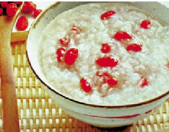 做法:①粳米淘洗後,加適量清水煮粥。②粥滾後加入枸杞子,一同熬煮,再放冰糖煮一會,即成。